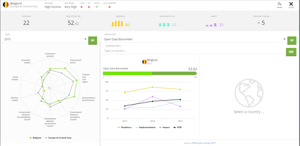 Yesterday the World Wide Web Foundation has released the third edition of the Open Data Barometer. A collaborative research that covers 92 countries and ranks them by three key parameters: readiness (how prepared are governments regarding open data initiatives?), implementation (are governments putting their commitments into practice?) and impact (is open government data being used in ways that result in practical benefits?). Let’s take a closer look at how Belgium did this year.